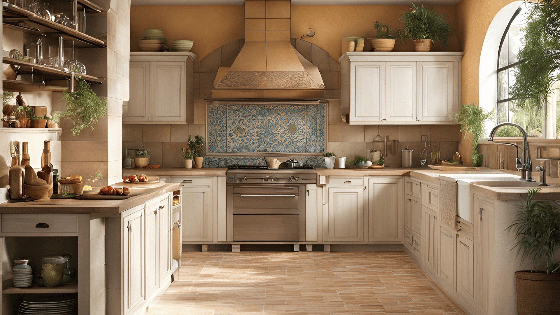 2. Přírodní materiály – Kameny, terakota, dřevo a keramika jsou základními stavebními kameny středomořského stylu. Kámen je často používán na podlahy, stěny nebo dokonce jako dekorativní prvky na stěnách. Terakota, s typicky teplými odstíny, se využívá hlavně na dlaždice nebo jako materiál pro nádoby a další dekorace. Dřevo je rovněž velmi častým prvkem, obzvláště tmavé a neopracované, které se používá jak pro trámy na stropě, tak pro nábytek či podlahy. Keramika, oblíbená zejména v kuchyních, může mít různé podoby – od tradičních malovaných talířů a váz po obkladačky s geometrickými nebo florálními vzory, typické pro země Středomoří.