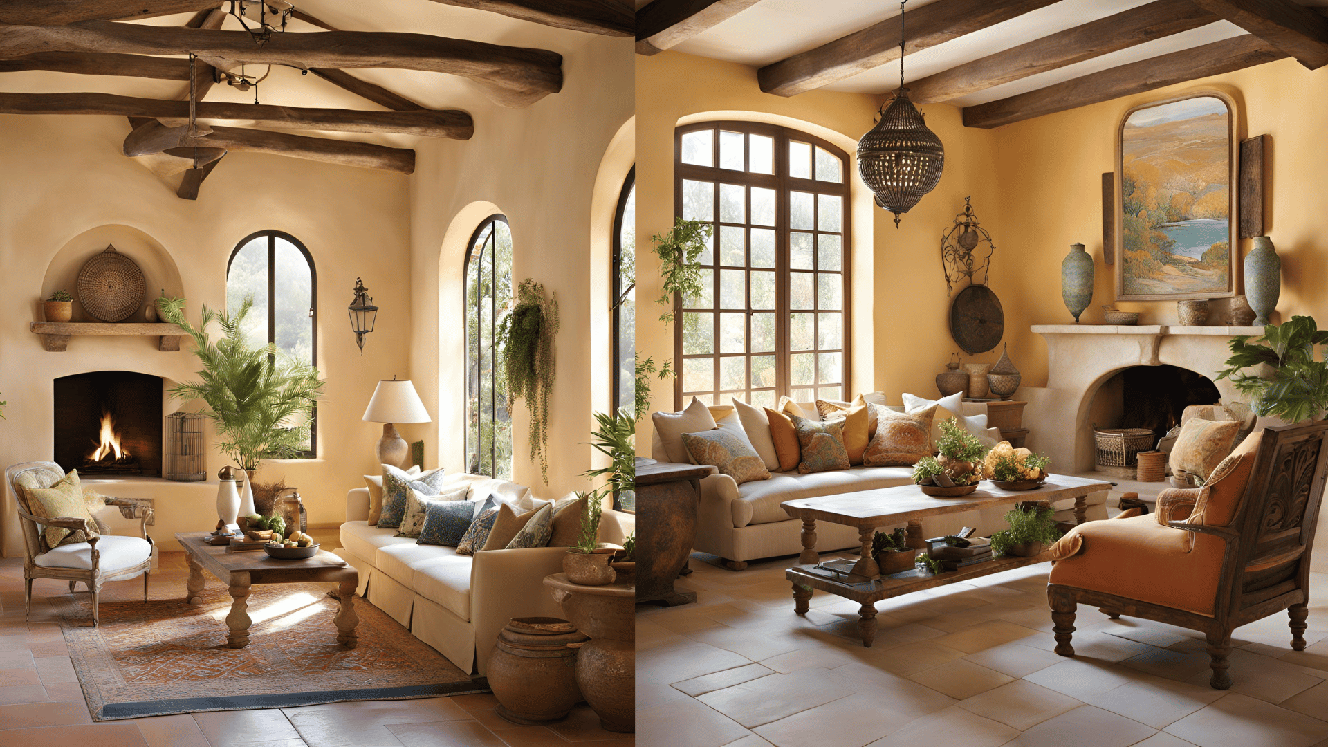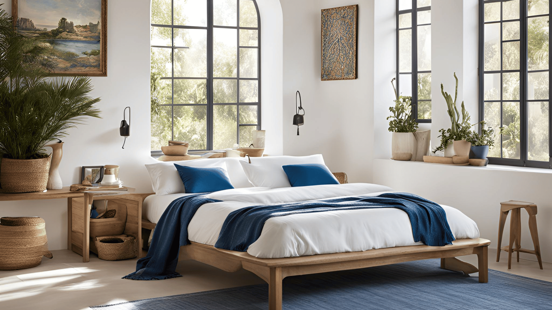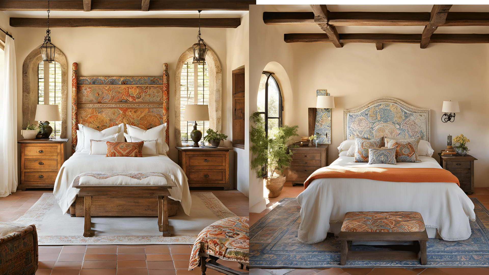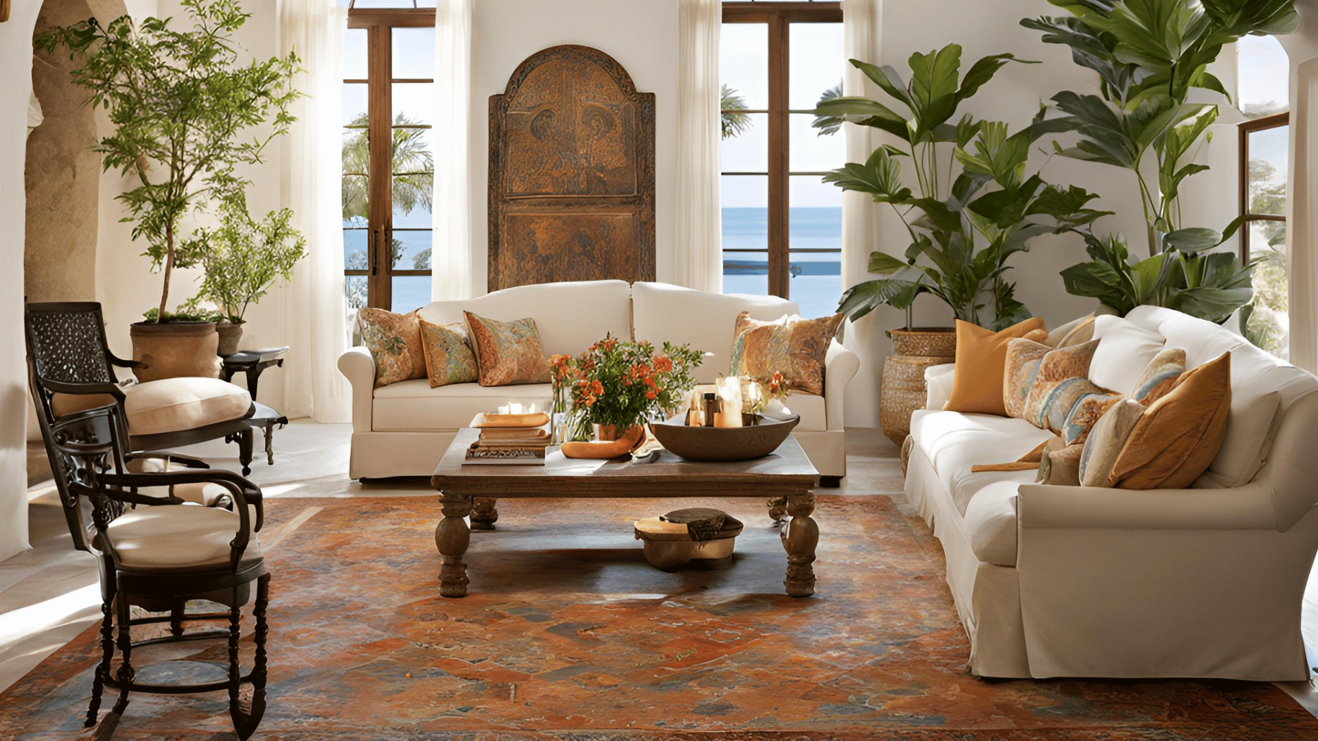 7. Dekorace – Tradiční ručně vyráběné předměty, jako je keramika s geometrickými či etnickými vzory, jsou typické pro tento styl. Koberce a tapiserie často obsahují vzory inspirované místními tradicemi a kulturou, což interiéru přidává jedinečnost. Další typické dekorace zahrnují dřevěné rámy na obrazy, kamenné sošky a ručně vyrobené keramické talíře, které mohou sloužit nejen jako praktické, ale i dekorativní prvky. Lucerny, závěsné lampy a svíčky přidávají místnostem teplé, přirozené osvětlení.
