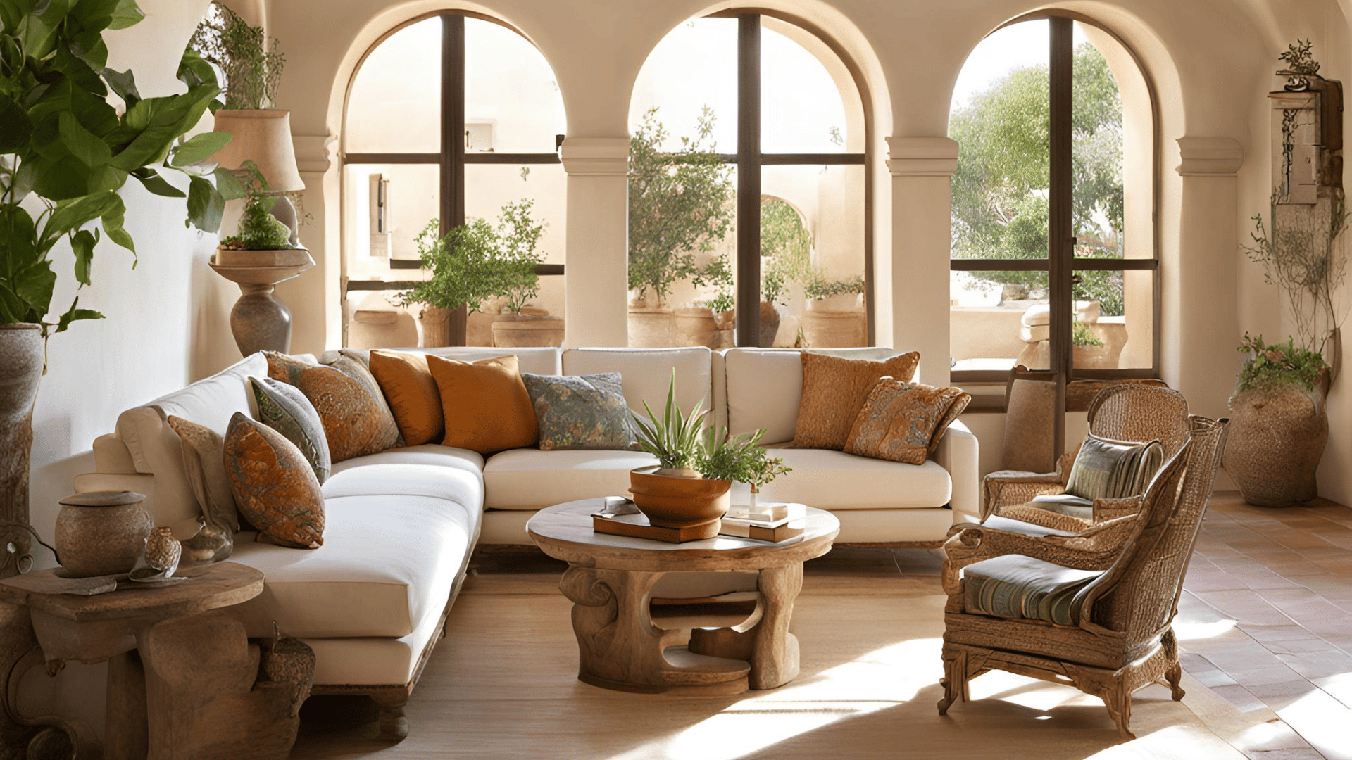 5. Inspirace přírodou – Organické tvary, jako jsou oblouky, zakulacené hrany a asymetrické linie, jsou běžné jak v architektonických prvcích, tak v nábytku a dekoracích. Mušle, větvičky, keramické nádoby a další přírodní prvky slouží jako dekorace a dodávají místnostem jemný nádech přírody. Rostliny, jako jsou olivovníky, levandule nebo sukulenty, jsou často používány jak venku, tak uvnitř domu, aby interiéru dodaly svěžest a spojení s přírodním světem.